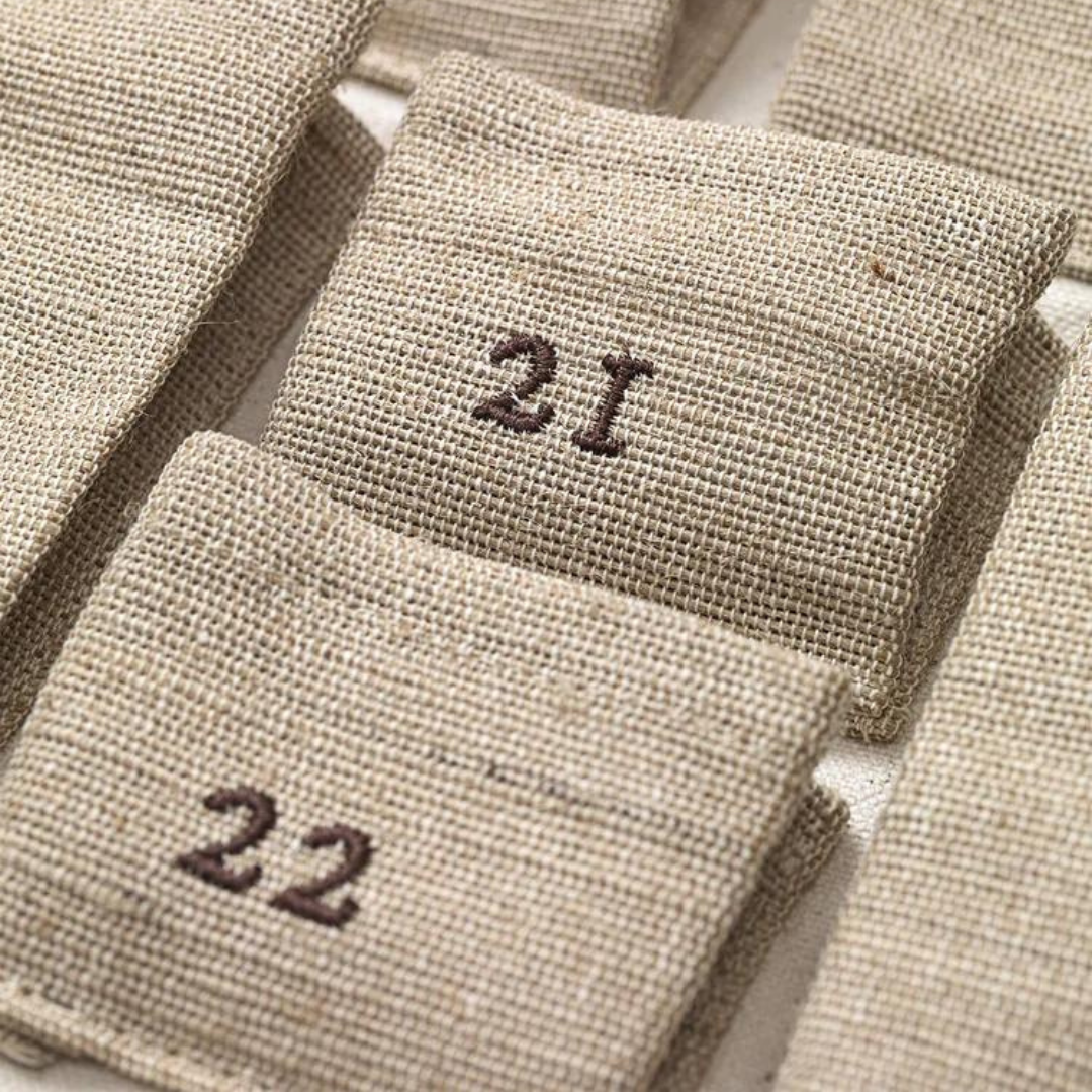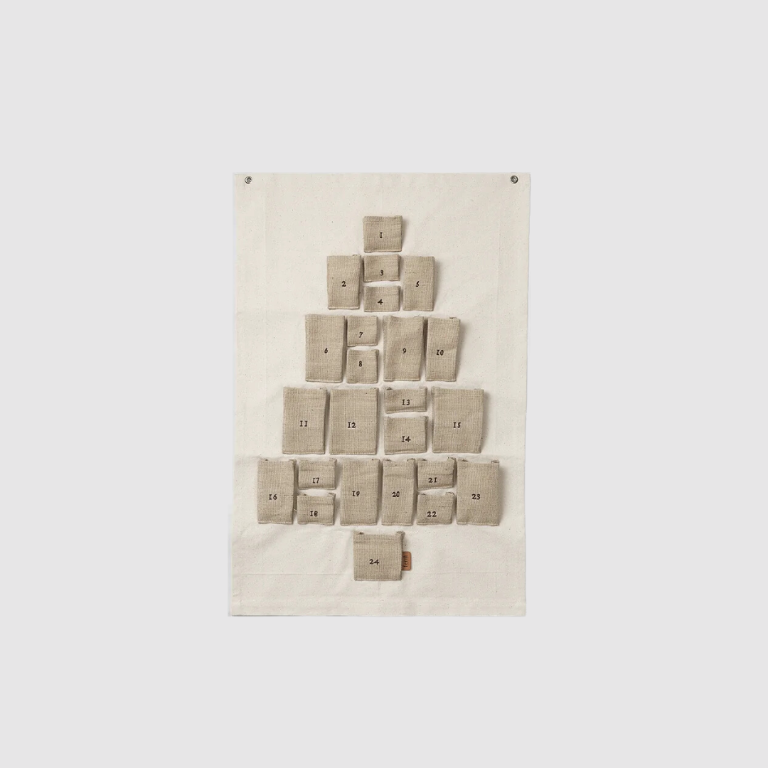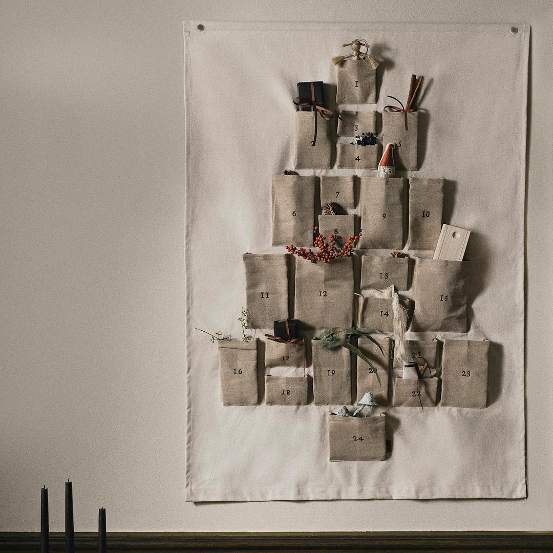The Pine Christmas calendar is a modern interpretation of the Danish tradition of an Advent calendar, the Jule calendar. This allows you to give a loved one a small gift every day in December before Christmas Eve. The Christmas calendar's base material is made from undyed cotton canvas, while the pockets are made from tactile, natural jute and together form the shape of a festive Christmas tree, with each pocket embroidered with a number between 1 and 24 indicating the date. With a metal eyelet in each top corner, the Pine Christmas Calendar is convenient and easy to attach to a wall or door.
