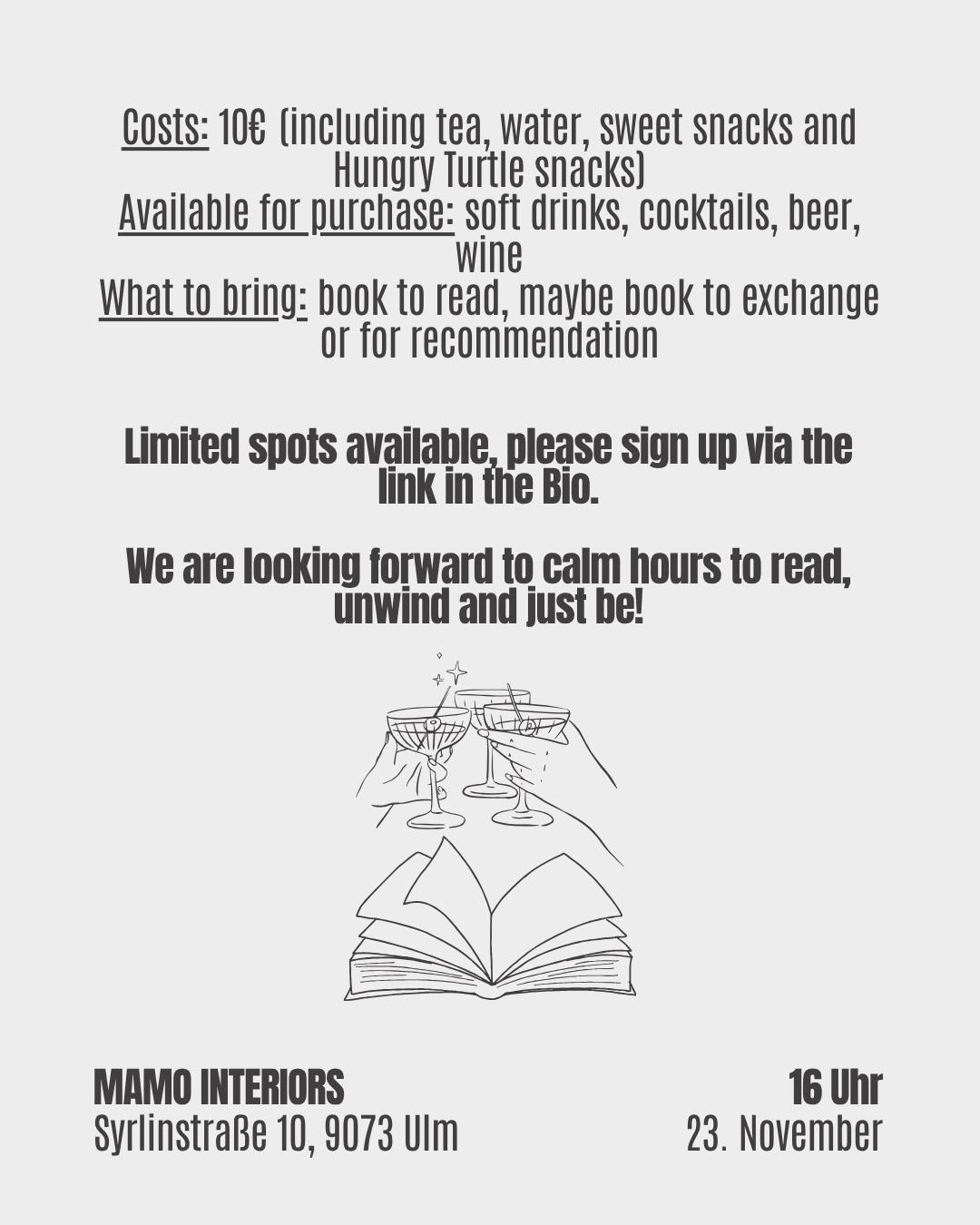 Mach es dir gemütlich, bring dein aktuelles Buch mit und genieße ruhige Stunden in sanftem Licht – umgeben von Design, Atmosphäre und anderen Bücherliebhaber:innen.